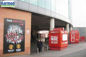 Manchester United kulübünün bilet ve kurumsal ürün satış yapılarında CTP polyester kabin modeli kullanıldı. Uzun ömürlü kullanım ve yalıtım üstünlüklerinin yanı sıra Karmod CTP kabin kurumsal konsept uygulamalarına elverişli modeliyle öne çıkıyor. Yapı dışı kurumsal renklerde boyanabiliyor veya daha sonradan dijital folyo kaplama uygulaması gerçekleştirerek kurumsal kimliğe kolayca kavuşturulabiliyor. Bu proje için üretilen 12 ürünün tamamı Manchester United futbol kulübünün kurumsal kimliğine özel uygulamalarla hazırlandı. Dijital uygulamalar sonrası kabinler kurumsal kimliğin bir parçası haline gelerek statla bütünleşti. Kullanıma hazır sevk edilerek aynı gün hizmete alındı.